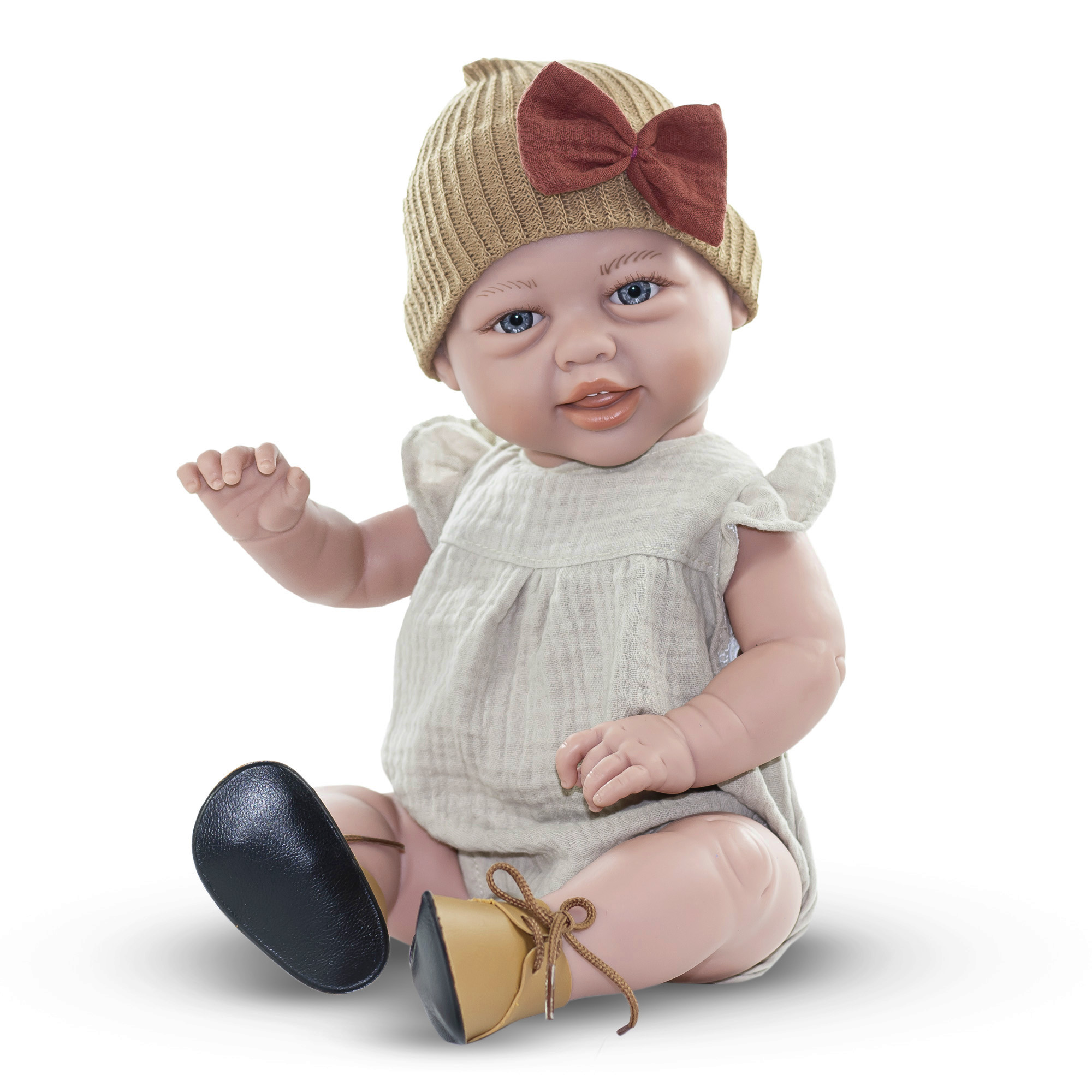 Niña sin pelo. Vestido fabricado en algodón. Sus ojos son de color gris. Incluye botitas. Muñeca anatómicamente correcta.