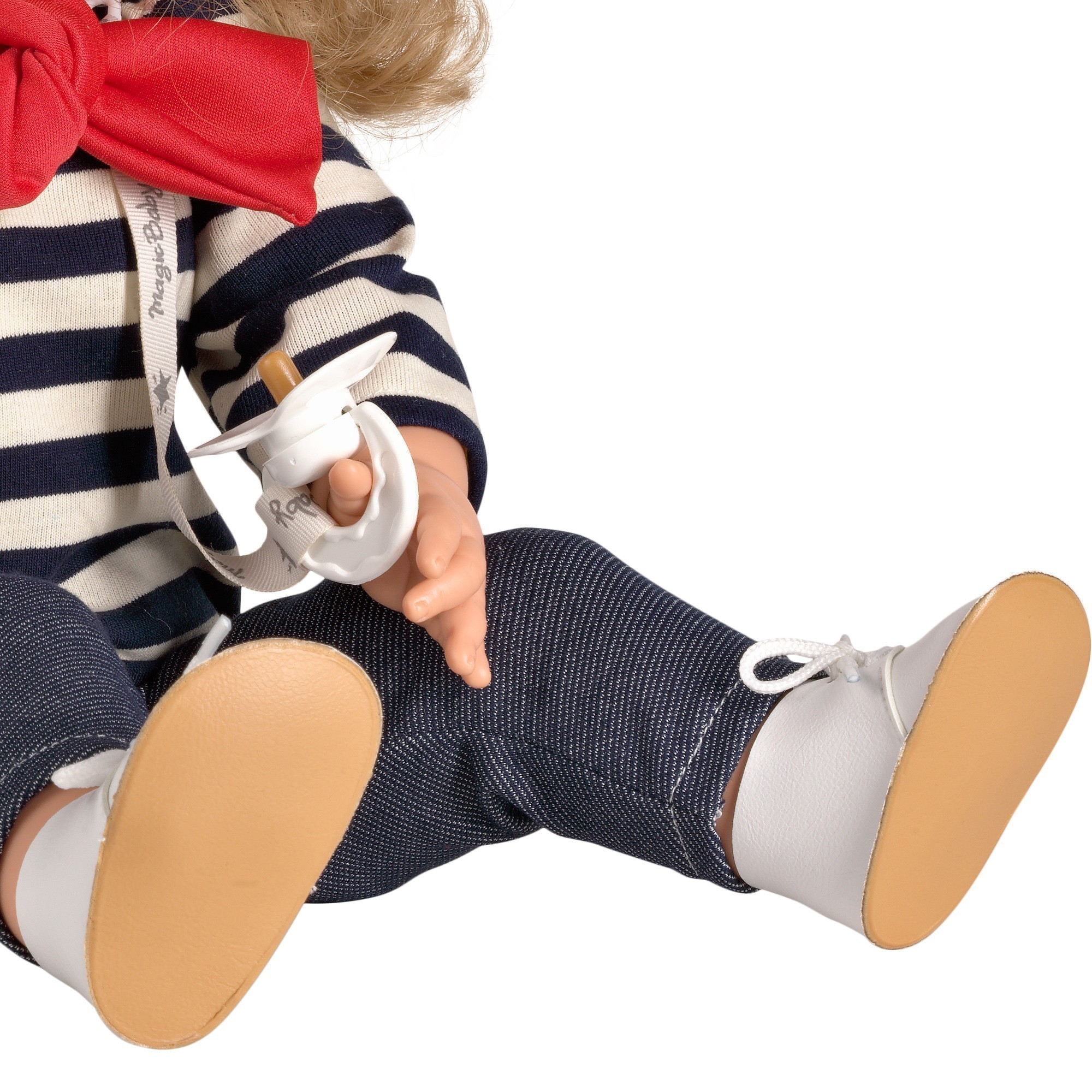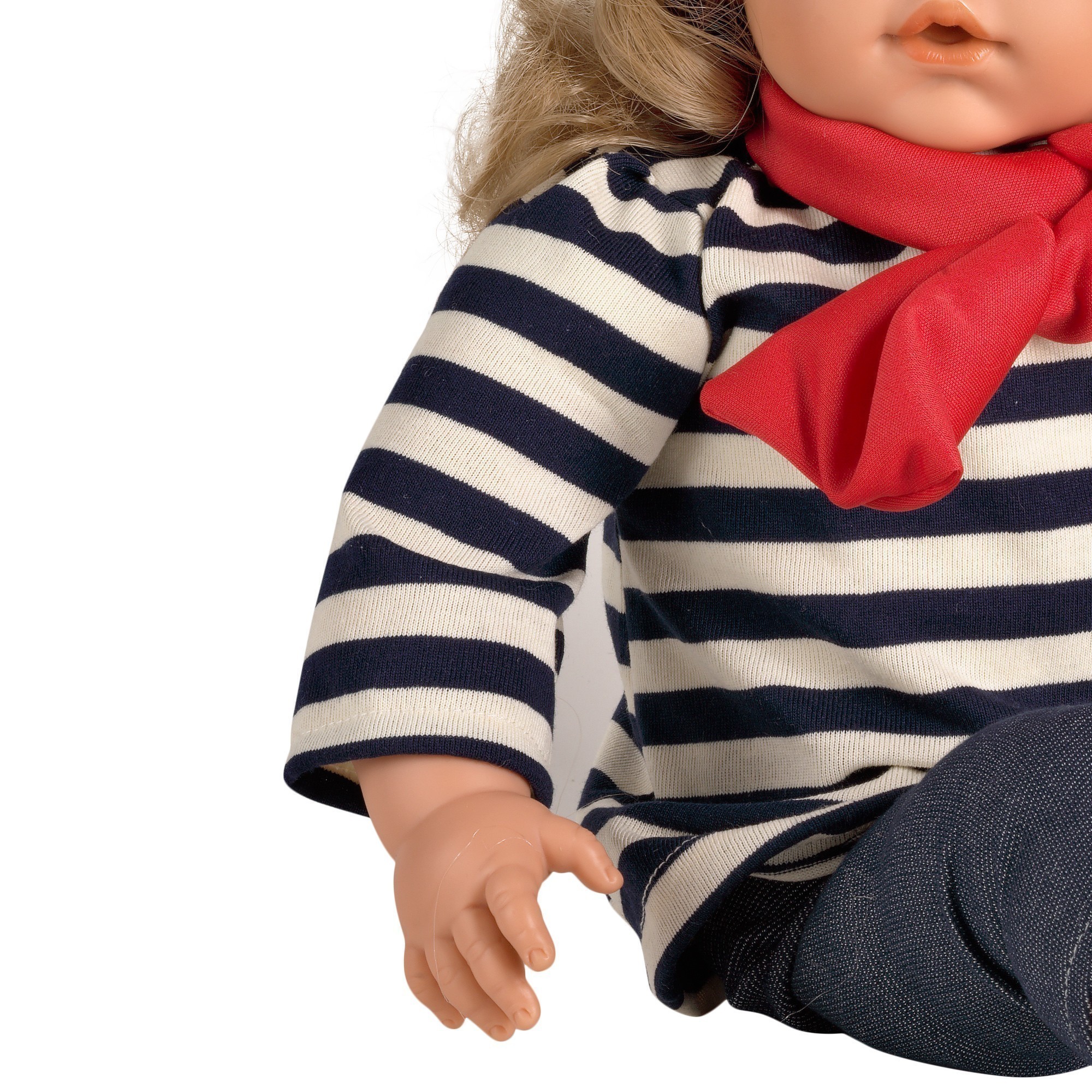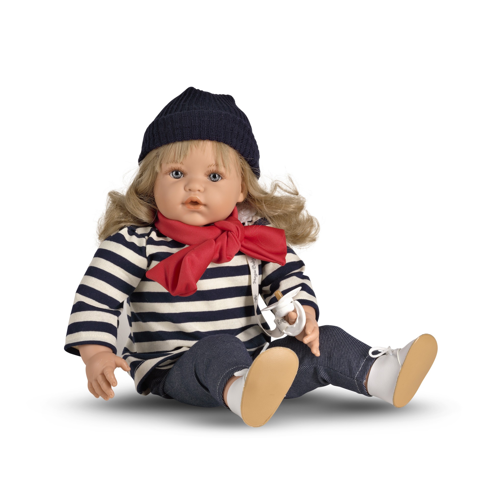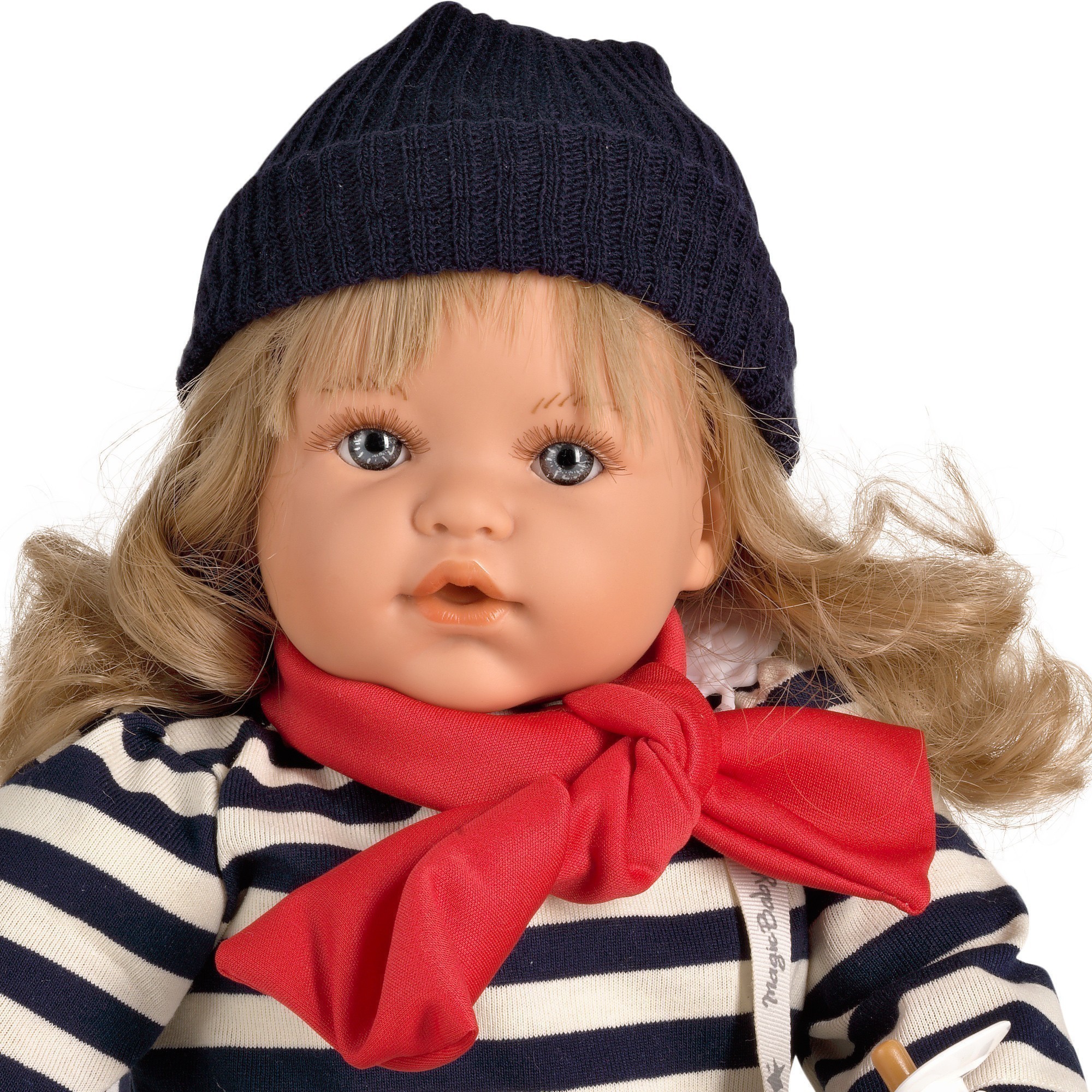 Muñeca con cabeza, brazos y piernas de vinilo y cuerpo blandito. Con mecanismo de pulsador que emite sonido. Presentado en una divertida caja que simula un taller de muñecas. Caja ecológica fabricada con material reciclado.